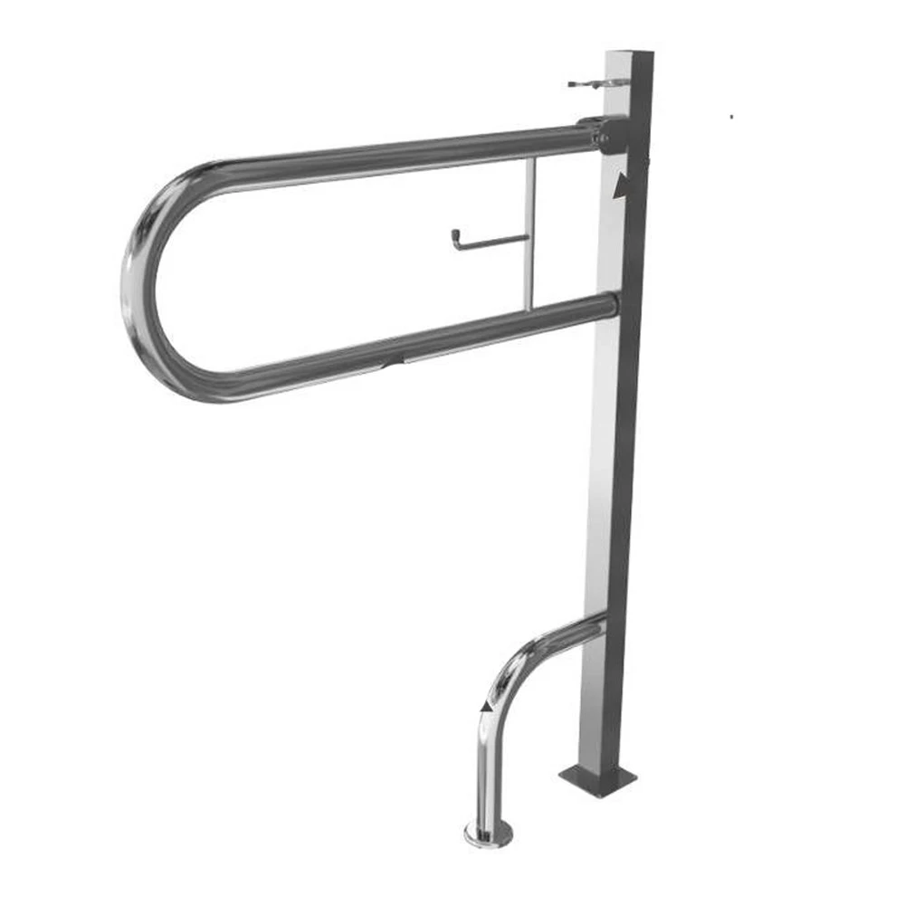 Р-образные поручни используют для оснащения унитазов в санузлах с недостаточной несущей способностью стен. Поручни имеют стойку напольного крепления с дополнительной опорой, а также подвижную U-образную часть, которая поднимается наверх и обеспечивает возможность пересадки с инвалидной коляски на унитаз. Чтобы правильно подобрать поручень, необходимо учитывать длину унитаза. Согласно ГОСТ Р 51261 поручень должен выступать вперед за передний край унитаза не менее чем на 150 мм.