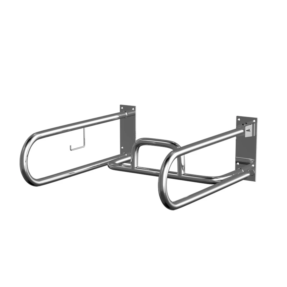 - Откидной механизм: позволяет поднять поручень наверх, обеспечивая возможность пересадки с инвалидной коляски и освобождая место. Продуманная конструкция откидного механизма предотвращает люфт в месте крепления и снижает риск расшатывания поручня с течением времени.