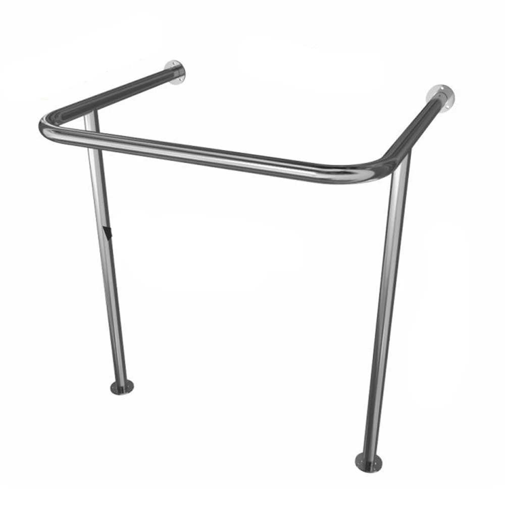 Поручень на стойках для раковины с увеличенной высотой 600х730х800мм, оснащен четырьмя опорами, 2 из которых размещены на полу, а остальные прикреплены к стенке. Опора произведена из качественной нержавеющей полированной стали.