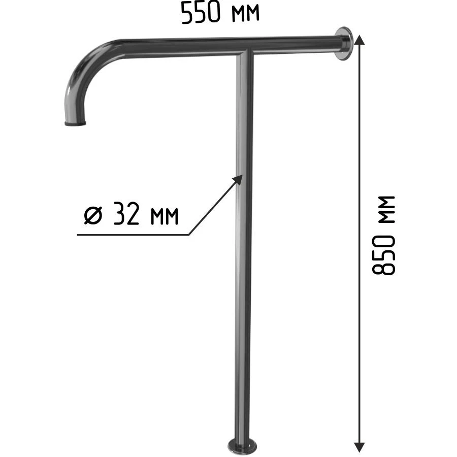 Поручень из нержавеющей стали марки AISI 304 предназначен для оснащения раковины. Поручень имеет опору существенно снижает нагрузку на стены и позволяет использовать поручни в санузлах с недостаточной несущей способностью стен. Согласно ГОСТ Р 51261 опора напольного крепления у Т-образного поручня для раковины должна быть удалена от его переднего края. Расстояние между передним краем поручня и опорой должно быть не менее половины всей его длины.