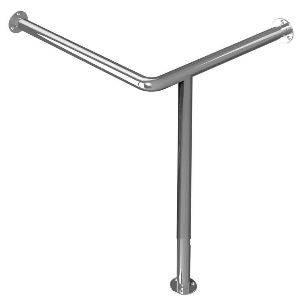 Поручень угловой из нержавеющей стали AISI 304 имеет 2 опоры настенного и 1 опору напольного крепления. Каждая их опор имеет по 3 точки крепления, что обеспечивает надежную фиксацию поручня. Фланцы с креплением закрываются эстетичными отражателями.
