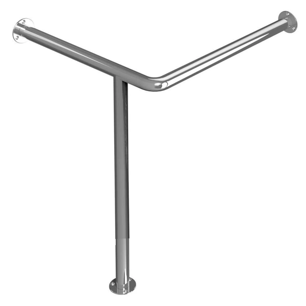 Поручень угловой из нержавеющей стали AISI 304 имеет 2 опоры настенного и 1 опору напольного крепления. Каждая их опор имеет по 3 точки крепления, что обеспечивает надежную фиксацию поручня. Фланцы с креплением закрываются эстетичными отражателями.