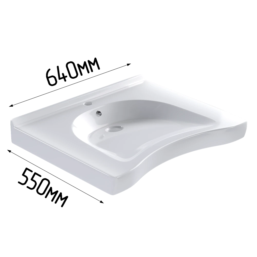 • Ширина раковины – 640 мм. К этой ширине добавляется расстояние до поручней, поэтому ширина итогового проема для ног также получается нормативной (от 0,75 мм.);